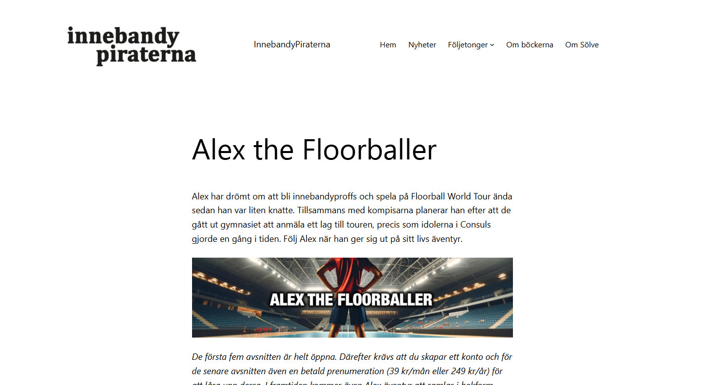 Jo, en sak som jag påmindes om när jag träffade alla unga innebandyspelare är att ta tag i berättelsen om Alex The Floorballer. Den som jag började publicera som följetong på min sajt 23min.se eftersom jag där hade funktionalitet för betalande prenumeranter. Men som av ovan nämnda skäl blivit nedprioriterad.
